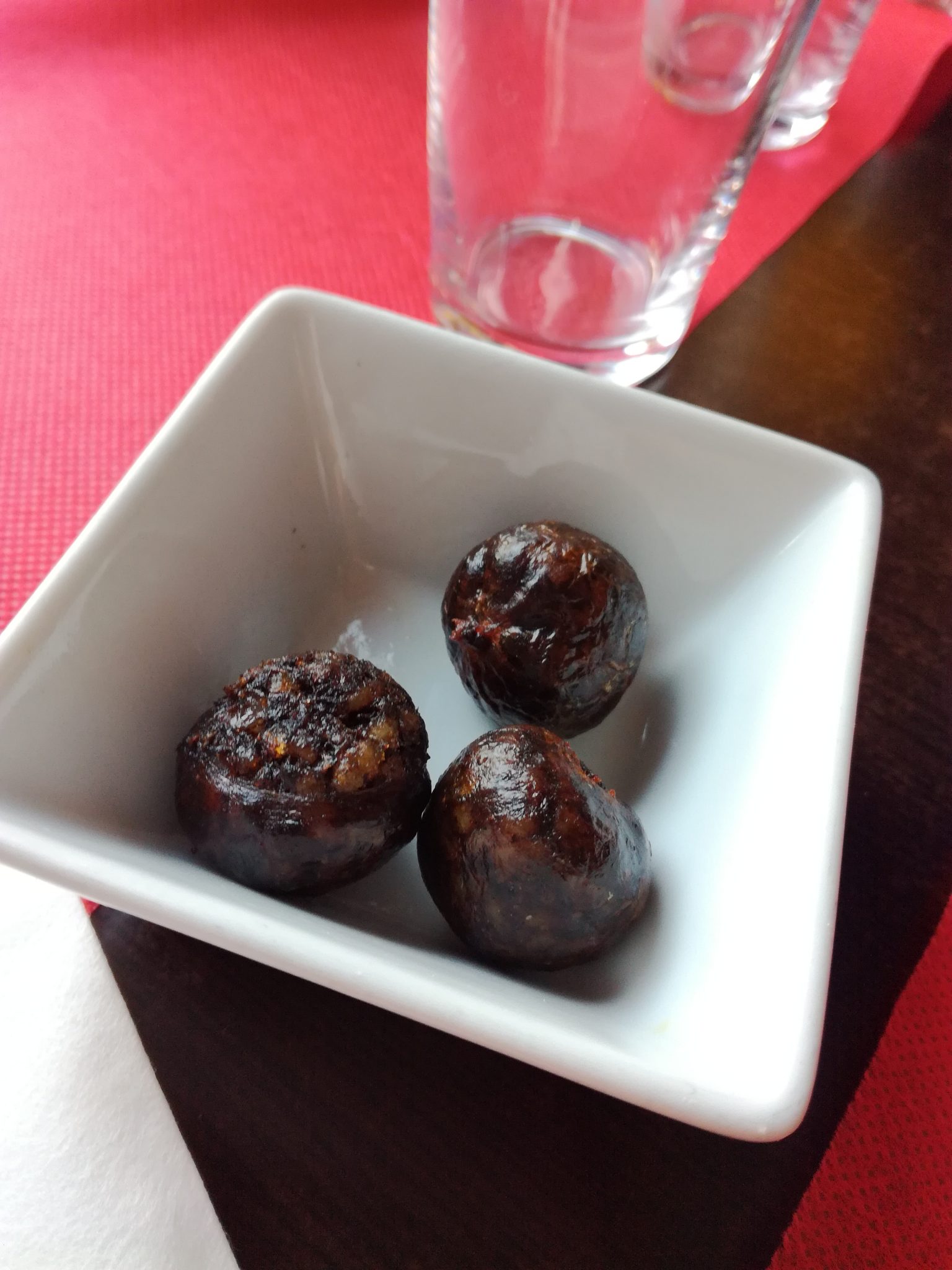 Mientras esperábamos los platos nos sirvieron un aperitivo de morcilla, que estaba bastante bueno. Siempre se agradecen estos detalles y más si se hace tarde para la hora de la comida. Las morcillas estaban buenas, no era cualquier cosa que había puesto para entretenernos.