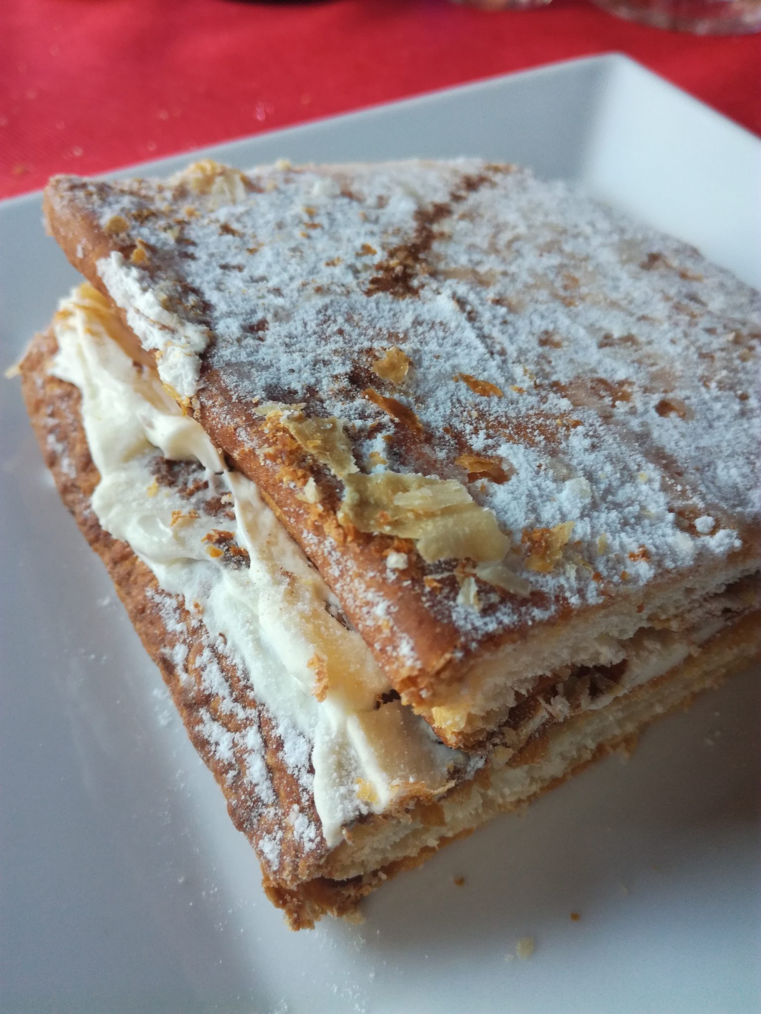 De postre compartimos dos opciones, la tarta de tres chocolates, y un milhojas. La tarta combinaba los tres chocolates haciendo una mezcla sabrosa, dulce pero sin empalagar.