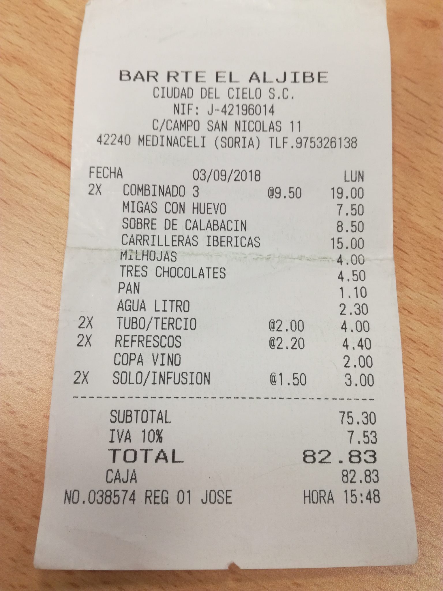 Durante toda la comida el servicio del restaurante El Aljibe fue atento, sin agobiar. El ambiente es agradable, tranquilo, luminoso, y los baños están limpios. Solo un pequeño pero a la terraza, y es que había muchas avispas. Por lo que hablamos con algún vecino de Medinaceli, este año han tenido una plaga. Nosotros desde el interior disfrutamos un montón la comida y estamos deseando volver. El precio es acorde con lo que se come, y poco más se puede pedir. El poder comer con vino tranquilamente, pero hay que conducir…