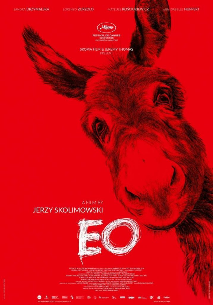 EO se titula así porque es el nombre que le da su dueña en el circo. Y se lo da porque EO se pronuncia en polaco como un rebuzno: IO. Y con este título y un cartel de lo más sugerente, con el burrito asomando la cabeza y mirándonos con descaro -y una pizca de tristeza- sobre el fondo rojo que tan significativo será en la película, EO se presentó en el festival de Cannes, conquistó a la crítica y al jurado, ya que le dio el premio que lleva su nombre, y continuó caminando hasta ser la enviada por Polonia al Oscar 2023. Y ya está ganando premios de la crítica norteamericana.