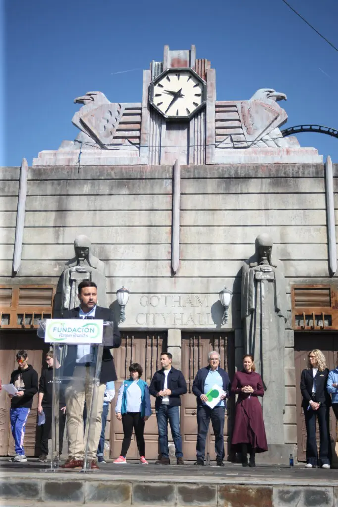 Para empezar, una vez que los chicos y sus familias llegaron a la plaza de Gotham y eligieron sus sitios, llenando por completo el espacio con gente que también se quedó de pie, Javier Guarido, director de Parque Warner, dio la bienvenida a los presentes. Explicó en qué consistía el día de hoy, para quiénes estaba destinado lo que se iba a hacer en la plaza y dio paso a Tomás A. Sancho, presidente de la asociación Plena Inclusión Madrid.
