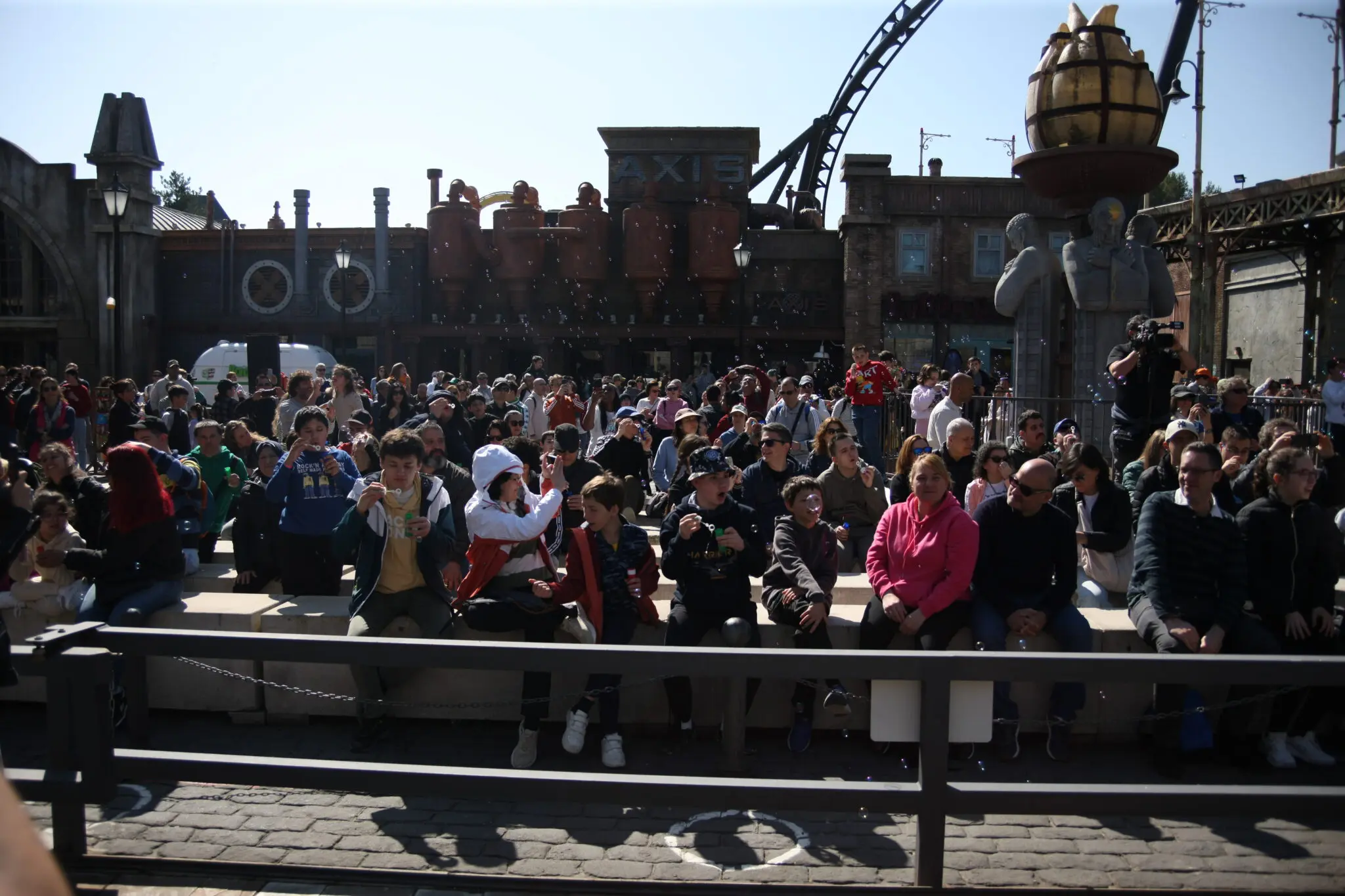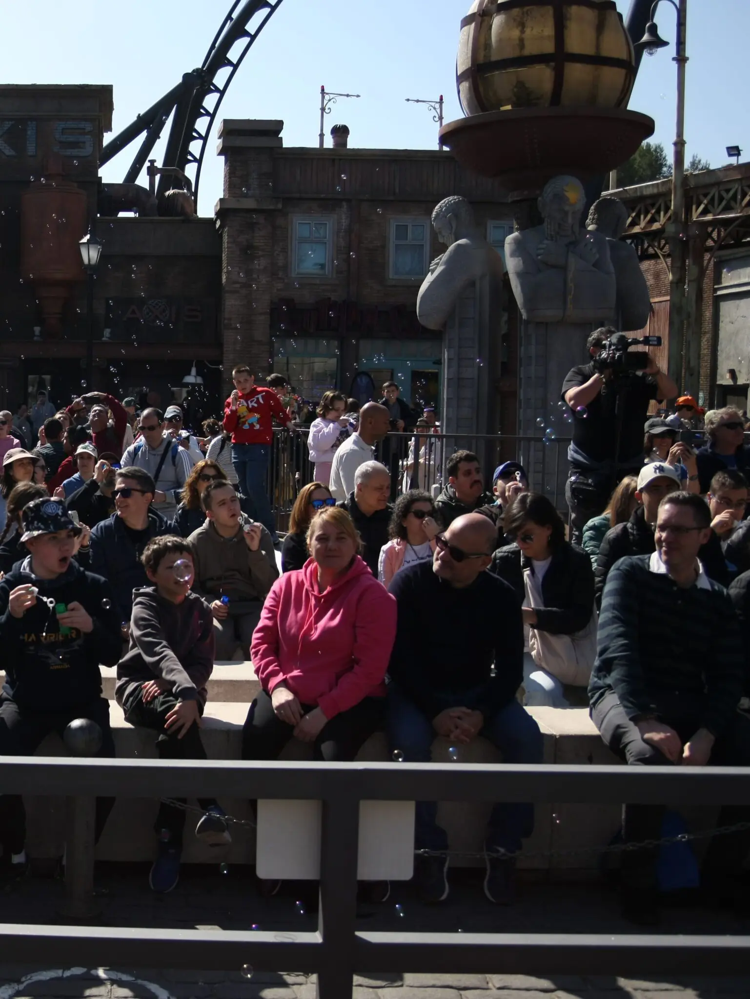 Las familias disponían de los pomperos, ya desde que comenzó el acto, unos pequeñitos, tradicionales, de los de toda la vida, que son más ligeros que los preciosos que están disponibles en las tiendas del parque con los personajes de Looney Tunes, y al acabar la lectura del Manifiesto los empezaron a abrir para estar preparadas con ellos en las manos. Al concluir la cuenta atrás, 3, 2, 1, los asistentes debían poner a prueba su oxígeno y lanzar las pompas por la plaza de Gotham.