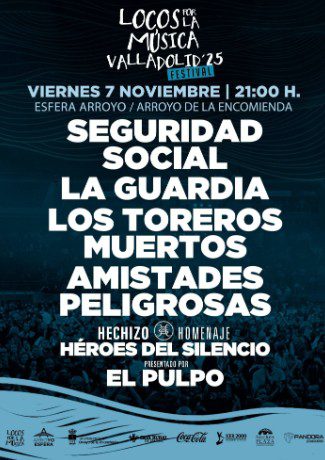 ¡Locos por la Música en Valladolid! El Viernes 7 de noviembre en Arroyo Esfera, lo mejor del pop y rock de la música española de los 80 y 90. Artistas que marcaron una generación, convertirán a Valladolid en una oda a la nostalgia. Seguridad Social, La Guardia, Los Toreros Muertos, Amistades Peligrosas, Hechizo en homenaje a Héroes del Silencio, presentado por El Pulpo