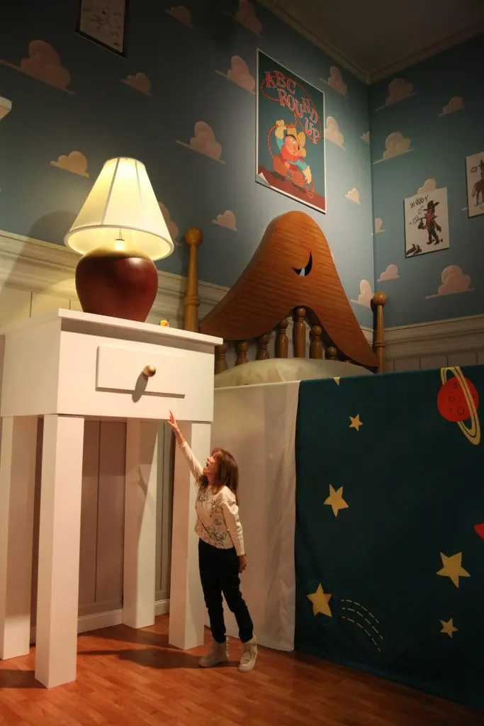 Enseguida vamos a pasar al cuarto de Andy, a esa fantasía que es Toy Story. Encontrarse con la cama y la mesilla a ese tamaño, como si nosotros fuéramos otros muñecos que comparten espacio con Woody y Buzz Lightyear, a quienes también veremos situados en la habitación, es una pasada. Todo en esta sala es brillante, vas a pasarte un buen rato haciéndote fotos en ella. El efecto de no llegar a la mesilla ni a la cama es fabuloso, te sientes como dentro de esa habitación en la que cuando Andy no está los juguetes cobran vida. Lo malo es que Andy no está y los juguetes no cobran vida… no sabemos si nos llevaríamos bien con Woody, aunque todo apunta a que sí, porque es un personaje maravilloso. A cambio, te puedes hacer una foto con su recreación, pero no te acerques mucho, que tienes un cordón de seguridad para que no puedas manosearlo. Lógico, por otro lado.