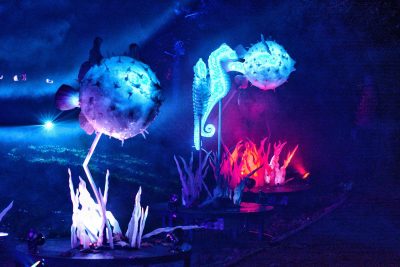 El recorrido comienza en un mundo acuático inspirado en las obras de Julio Verne, donde los visitantes se encuentran con ballenas gigantes, medusas luminosas y criaturas del abismo. A continuación, se avanza hacia tierra firme, un entorno habitado por animales salvajes e insectos exóticos que transportan a otros mundos. Finalmente, el mundo aéreo invita a los visitantes a experimentar la sensación del vuelo, donde incluso el más ligero aleteo se convierte en pura magia.