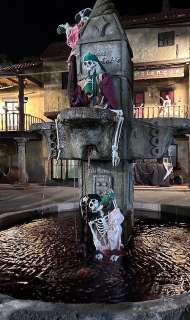 Fue en la zona de El Palenque, que también está tematizada de Halloween, fuente sanguinolenta incluida. Qué bonito todo, y encima con la iluminación nocturna, que lo hace más tenebroso todavía.