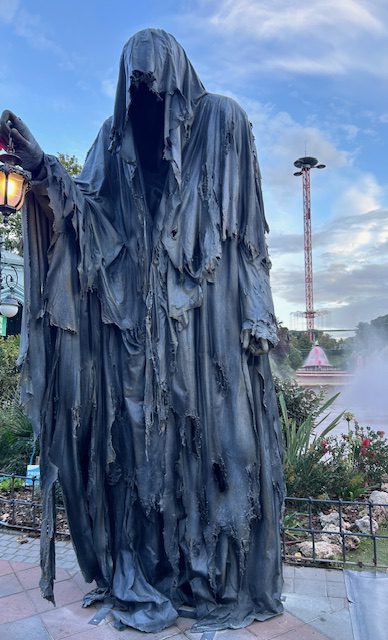 Y llegados a la explanada con la clásica, icónica y preciosa fuente a modo de cascada que recorre el vial central del parque, ya nos situamos en el lugar previsto para el photocall de los famosos, presidido por dos figuras Nazgûl de El Señor de los Anillos, que formaban parte de la tematización de Halloween. Espectaculares, todo hay que decirlo.