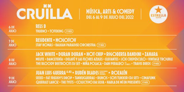 ![]() Te presentamos el Line-Up del Festival Cruïlla 2022, un Big Bang en el que concentramos todo nuestro conocimiento y experiencia para generar una gran explosión de diversidad musical. ![]() Juan Luis Guerra en Cruïlla 2022 La primera consecuencia de esta explosión de talento es que Rubén Blades y Juan Luis Guerra actuarán en el mismo festival por primera vez en Europa. El Big Bang también trae grandes confirmaciones como Duran Duran, Molotov, Jack White o Rigoberta Bandini. ![]() Duran Duran, gran sorpresa en el Cruïlla Además, el Festival Cruïlla se expande y pasa a durar cuatro días: del miércoles 6 al sábado 9 de julio. Y, de la misma manera que el universo, Cruïlla seguirá expandiéndose: pronto llegarán más nombres al cartel musical, toda la programación del Comedy y Arts. Y este año, ¡una selección gastronómica para chuparse los dedos! Para adquirir tus entradas, da click en este link para que no te quedes fuera de uno de los mejores festivales musicales de España, el Cruïlla: https://n9.cl/ah8pe |