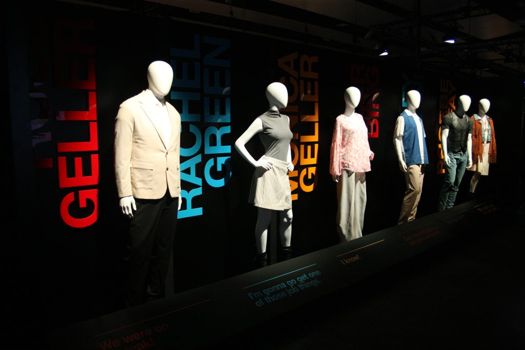 The Friends Experience da comienzo así, como la serie, con la fuente de las cabeceras de las distintas temporadas -que en la exposición del Matadero se podía complementar con paraguas de colores que allí tenían- y continúa ya con salas que mezclan los puros sets recreados en los que hacerte fotos con los paneles informativos de distintos detalles de producción. Por poner un ejemplo, tras el set de la fuente y el sillón pasamos a la información sobre el vestuario, con un vídeo de su diseñadora contando cómo se concibieron los distintos atuendos de los personajes. Vamos a tener también bocetos de sus trajes, y enfrente de ese panel unos maniquíes vestidos con las ropas que los identifican.